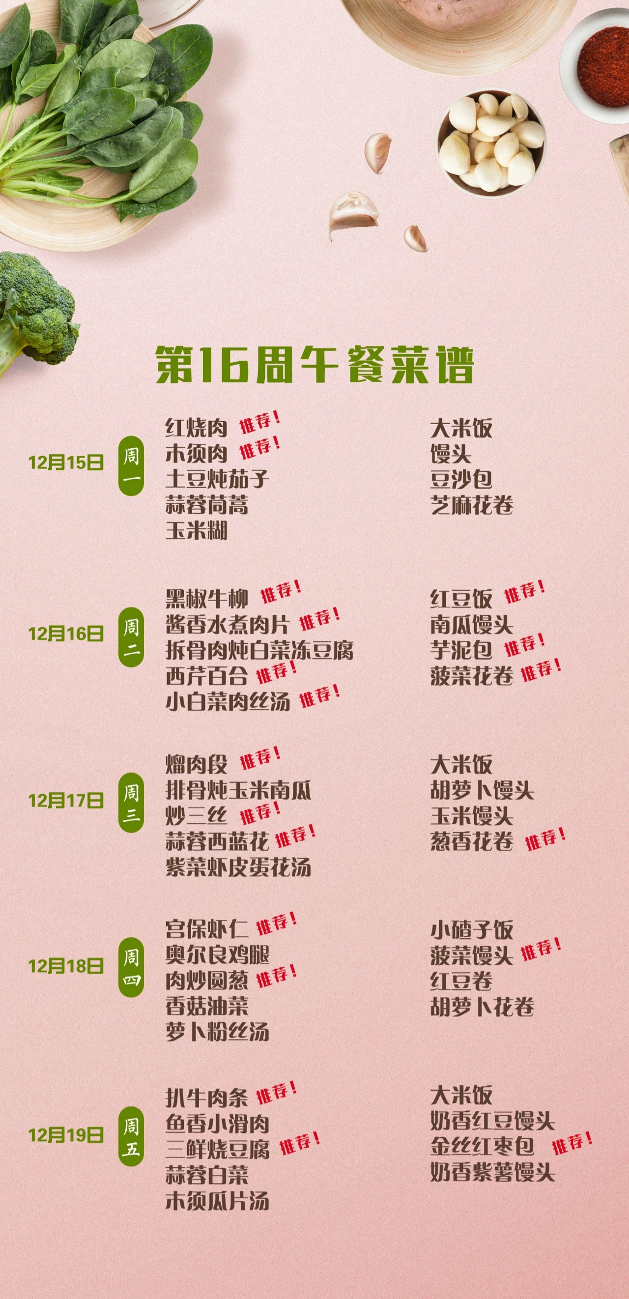一起重温第十六周午餐菜谱中的佳肴