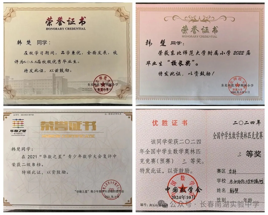 韩楚,长春南湖实验中学2022级学生。他品学兼优,性格阳光开朗、自信豁达,勤于思考且思维敏捷。他始终以谦虚坚韧的态度面对学习与生活,尊师重道,友善同窗。在校内,他成绩优异,积极参与各类活动;在校外,他勇于挑战竞赛,在实践与竞争中开阔视野,提升综合素养。他铭记“荣效报国,我辈担当”的校训,脚踏实地,心怀理想。