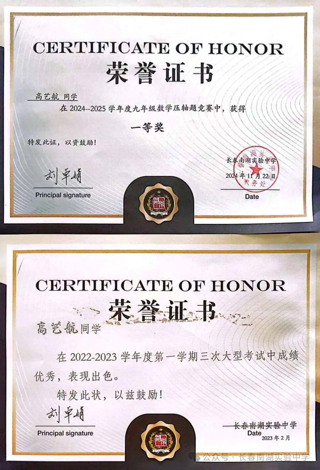 高艺航,长春南湖实验中学2022级17班数学科代表。她成绩优异,数学学科尤为突出,在各大考试中经常位列前茅。她思维敏捷,课上能紧跟老师节奏,快速捕捉知识要点;课下主动钻研拓展,常为同学答疑解惑。她性格温柔大方,如春日微风,积极融入集体。在求学这条路上,她踔厉奋发,笃行不怠,以勤奋为笔,书写书山精彩;以刻苦为墨,晕染学海波澜,塑造出兼具智慧与温情的少女魂。她将永葆追光热忱,长绽青春芳华 。