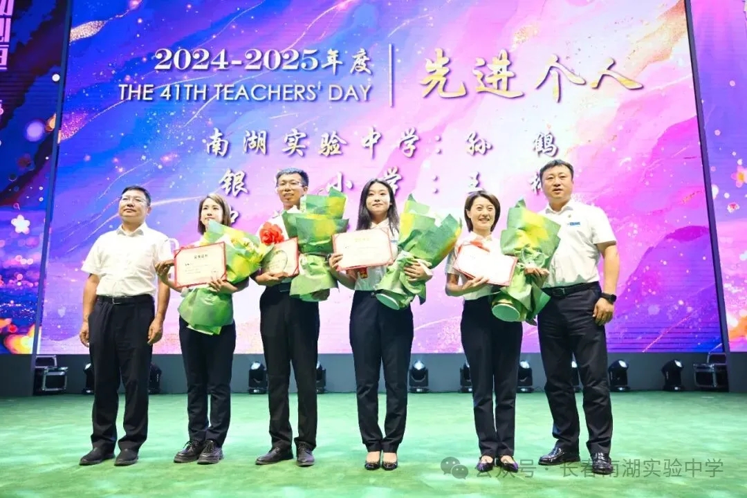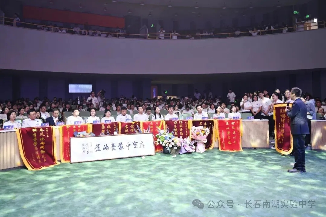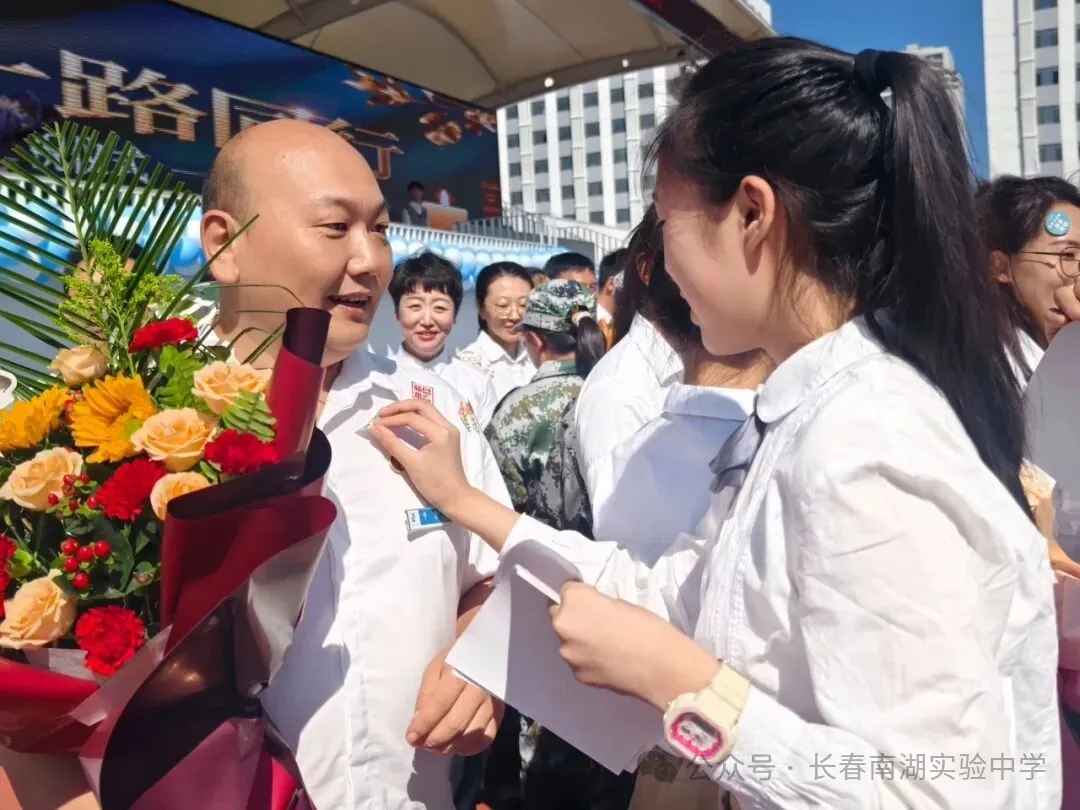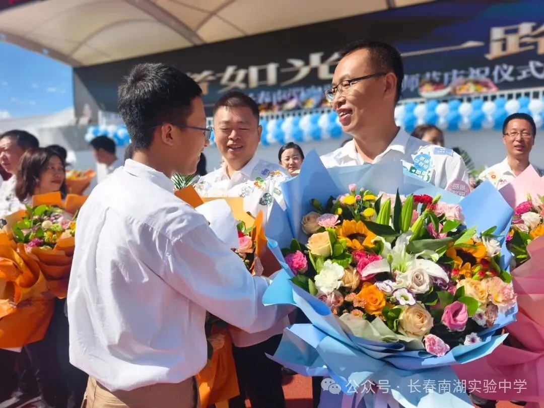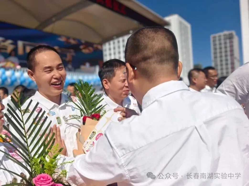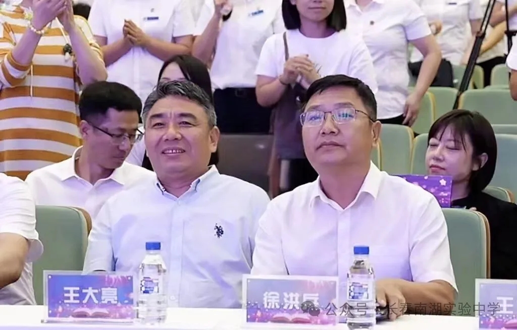 长春南湖实验中学新校园落地净月高新区,得到净月高新区各部门的关心和支持,尤其净月高新区教育局的各位领导一直关注项目进展,不仅多次实地调研、协调解决相关难题,还在政策指导等方面给予全方位支持,全力保障新校址建设顺利推进、搬迁工作平稳落地。这次教师节,净月高新区教育党委书记、局长徐洪兵,副局长王大亮更是亲临颁奖典礼,并为"先进个人"及"先进班集体"颁奖。两位领导亲切慰问获奖代表,勉励全体教师,其深切关怀极大地鼓舞了全体教师坚守初心、奋发作为的热情。