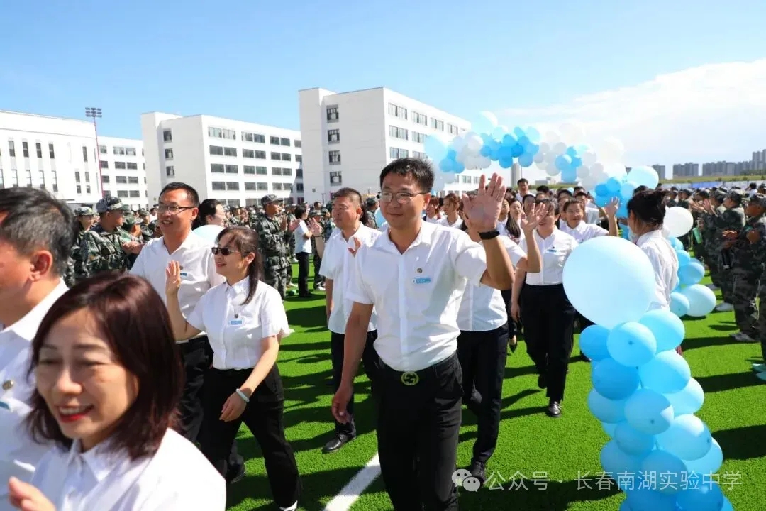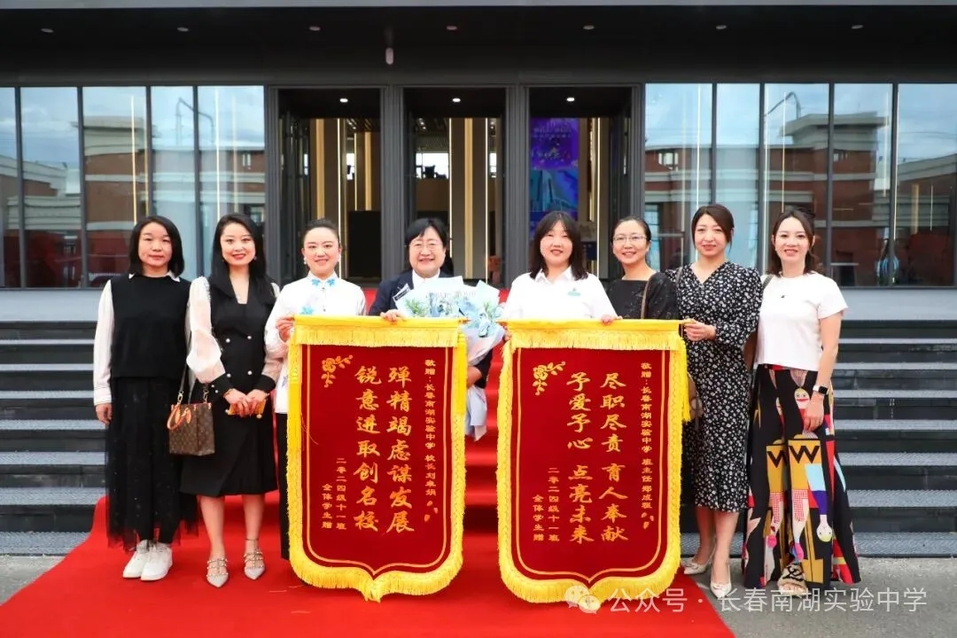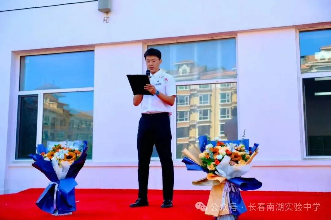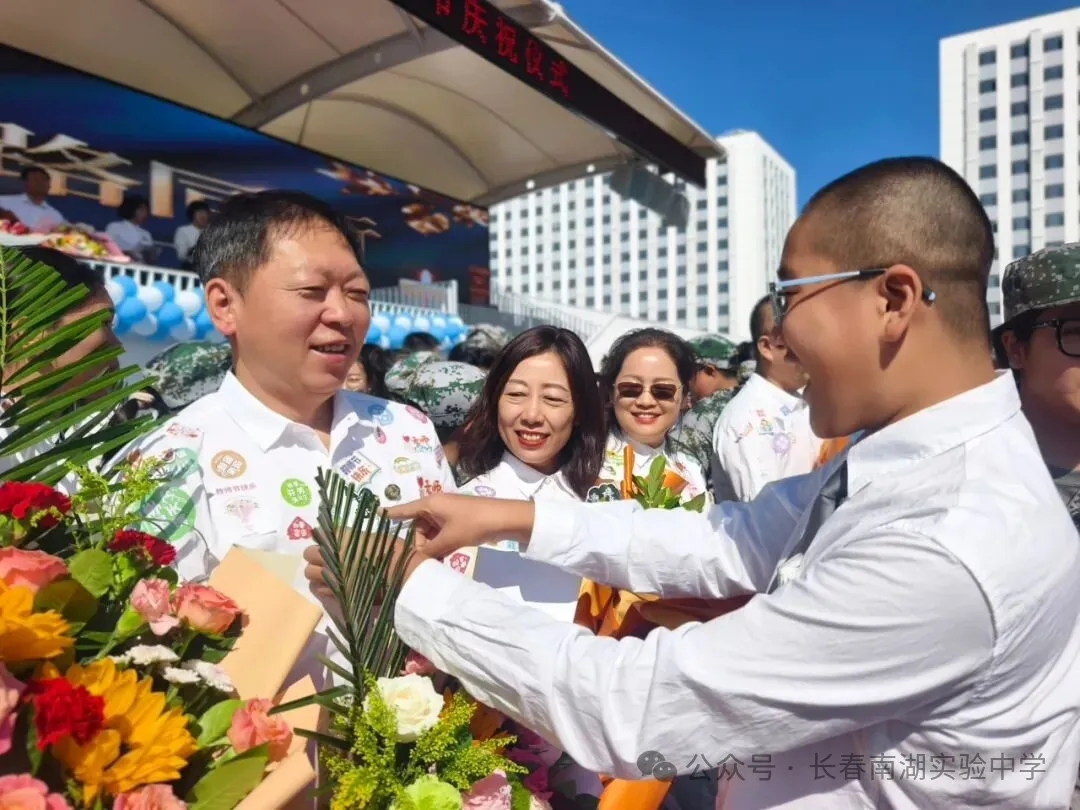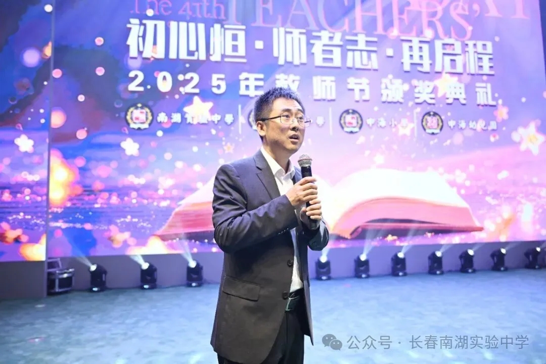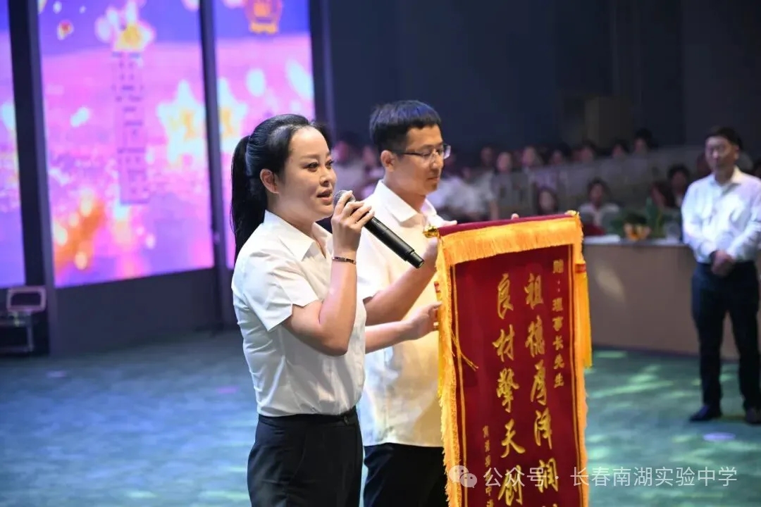 长春南湖实验中学新校园落地净月高新区,得到净月高新区各部门的关心和支持,尤其净月高新区教育局的各位领导一直关注项目进展,不仅多次实地调研、协调解决相关难题,还在政策指导等方面给予全方位支持,全力保障新校址建设顺利推进、搬迁工作平稳落地。这次教师节,净月高新区教育党委书记、局长徐洪兵,副局长王大亮更是亲临颁奖典礼,并为"先进个人"及"先进班集体"颁奖。两位领导亲切慰问获奖代表,勉励全体教师,其深切关怀极大地鼓舞了全体教师坚守初心、奋发作为的热情。