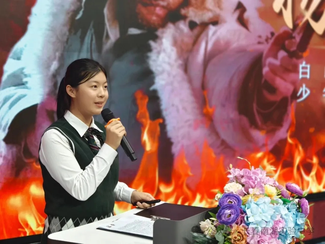 七年十班邵莞宁同学深情讲述“燃灯校长”张桂梅的事迹。她扎根大山数十载,用瘦弱的肩膀扛起万千女孩的求学梦想,以毕生心血诠释着教育者的坚守与大爱,让在场师生深刻感悟到无私奉献的精神真谛。