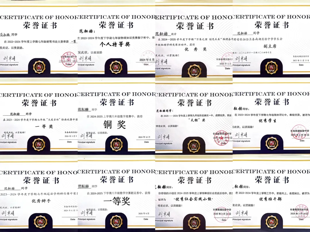 范耘赫同学,你对数学的热爱如同璀璨星光,照亮了自己的学习之路,也感染着身边的师生。课堂上,你总能带着饱满的热情专注倾听,面对复杂的数学问题,不仅能快速捕捉关键信息,更能主动跳出固有思路,用灵活多样的方法寻求解答,展现出远超同龄人的逻辑思辨能力与创新意识。