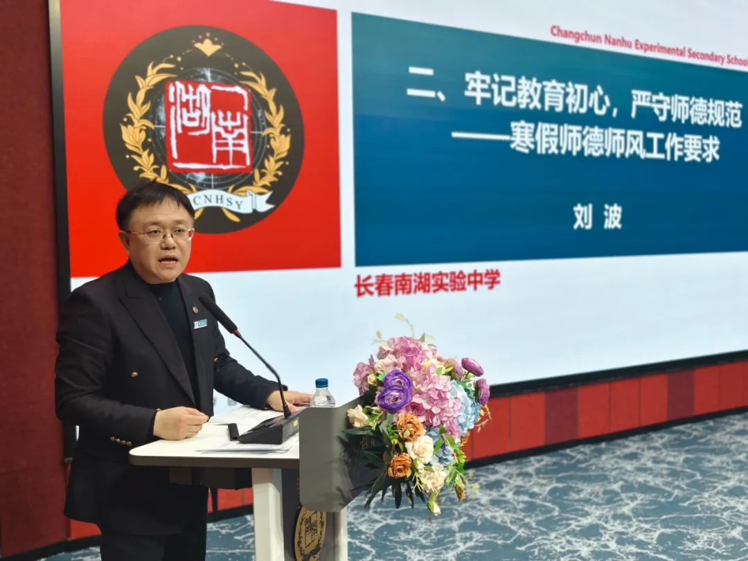 大会上,刘波常务副校长做了寒假师德师风工作要求。他通过典型案例开展警示教育,明确要求全体南湖教师严禁从事有偿补课及任何形式的变相补课。同时,他积极倡导广大教师成为“终身运动者、责任担当者、问题解决者、优雅生活者”,度过一个既符合规定、又充实有益的假期。