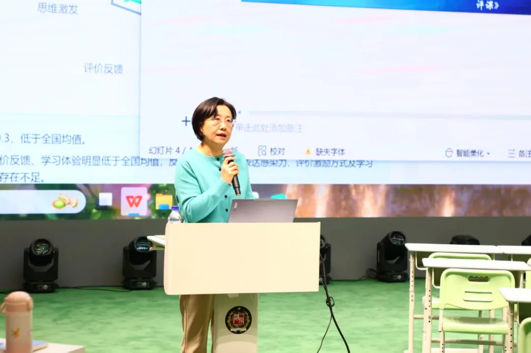 张波教研员基于为期两天的AI赋能教学教研活动,分享了兴奋、激动、忐忑三种心情。她指出,南湖实验学校青年教师在AI教学领域的深度探索成果令人振奋。她高度肯定了王钰、刘洋老师在命题与数据分析上下足的苦功;更由衷盛赞马燕妮老师是一位“具有大智慧的引领者”。她通过娴熟的AI工具使用与大胆创新,把学习的真正主动权还给了学生!张老师高瞻远瞩地指出,在新时代的“师、生、机三元互动课堂”中,AI将完美承担起“数据分析师、内容推送者、互动检验者”的三重角色。