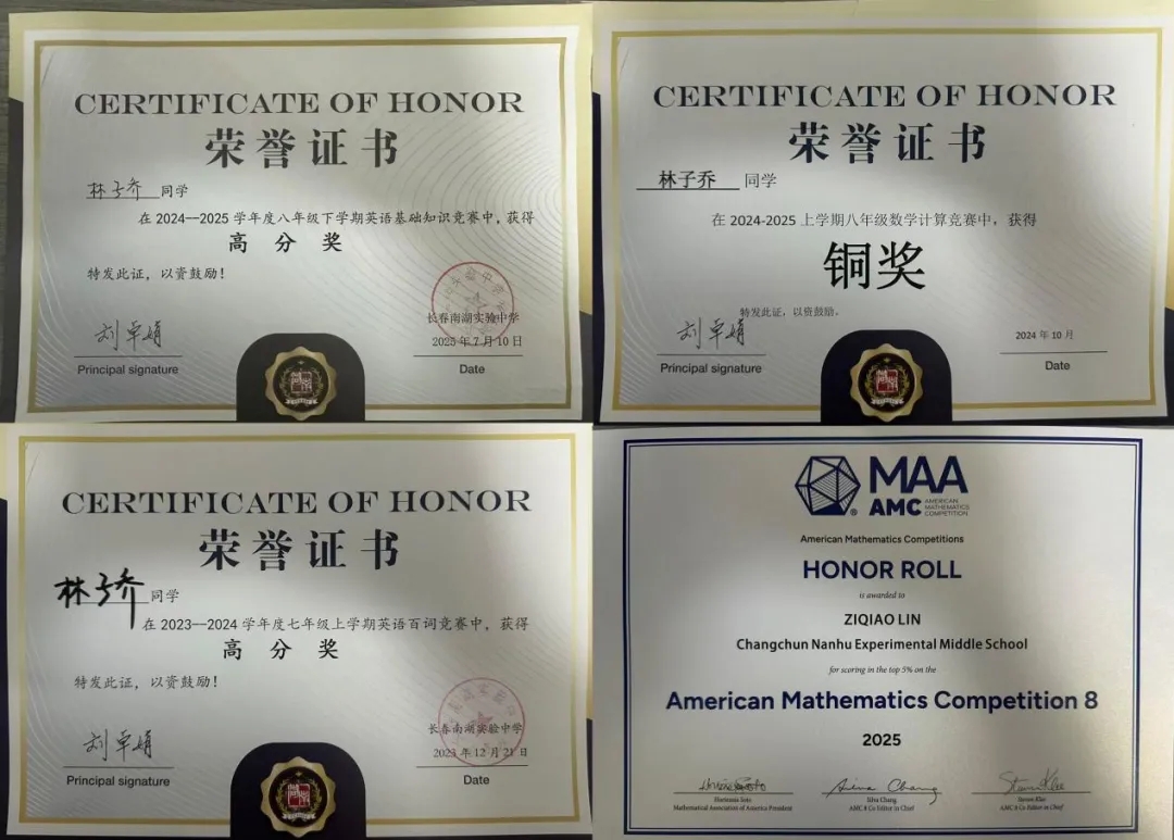 林子乔,长春南湖实验中学2023级15班学生。他勤奋好学、谦逊有礼、尊重师长,团结同学、成绩优异。他在知识的海洋中潜心探索、格物致知,在实践的天地里奇思妙想、精益求精。他始终谨记“荣校报国,我辈担当”的校训,坚定不移地朝着“国之栋梁”的理想不断前行。