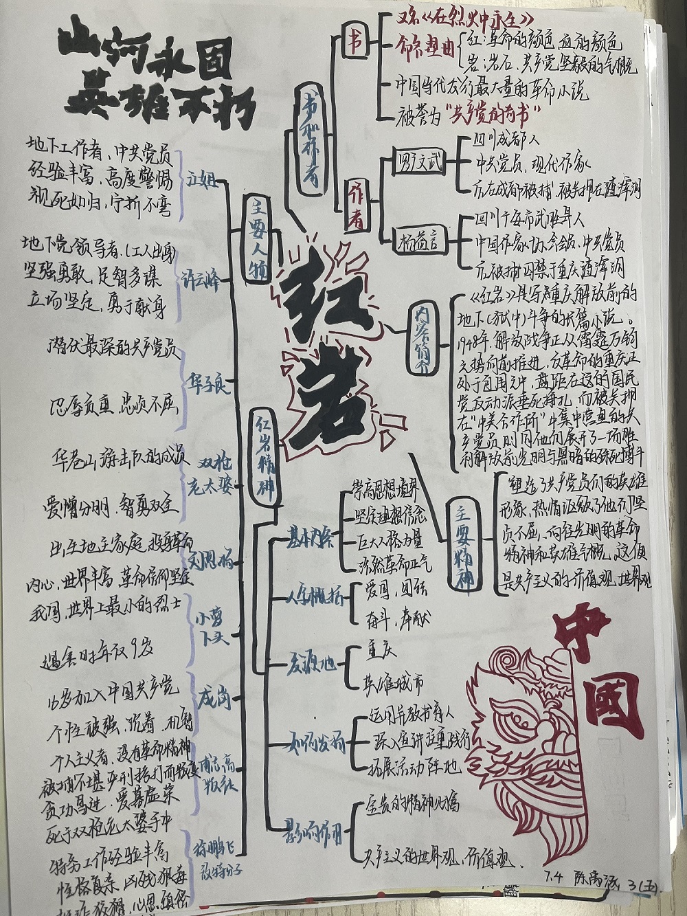 为深化经典名著阅读,激发学生创新思维,长春南湖实验中学七年级语文组于3月6日举办“经典与思维的碰撞”名著思维导图展。本次活动以《骆驼祥子》《红岩》两部经典著作为载体,引导学生通过思维导图形式展现阅读成果,呈现了一场别开生面的文学盛宴。