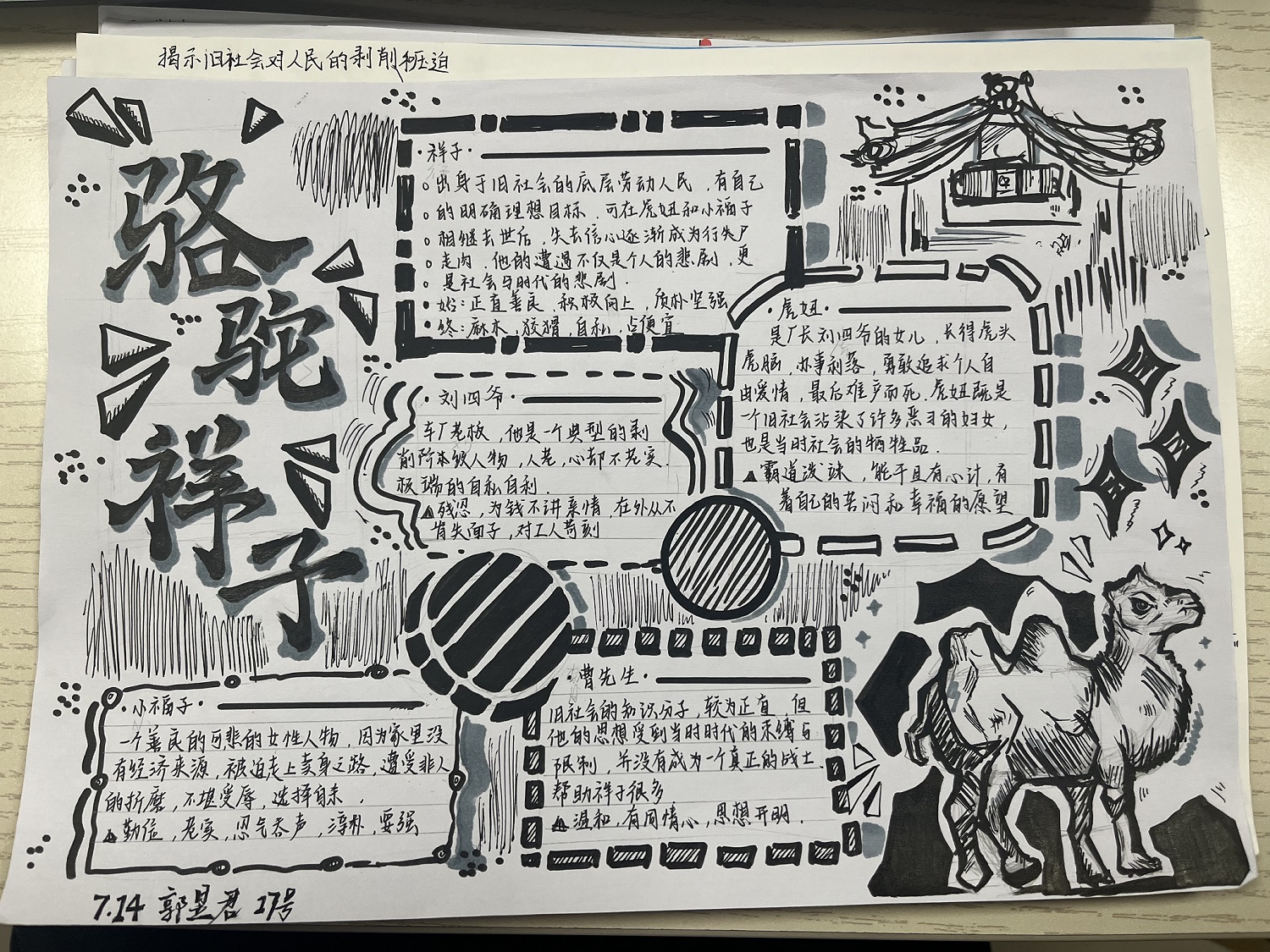 学生们运用图文并茂的思维导图,对老舍笔下的旧社会图景进行多维解析:祥子三起三落的命运轨迹、人物性格的变化过程、城市底层生态的细节呈现,在彩色线条与关键词的编织中变得立体可触。